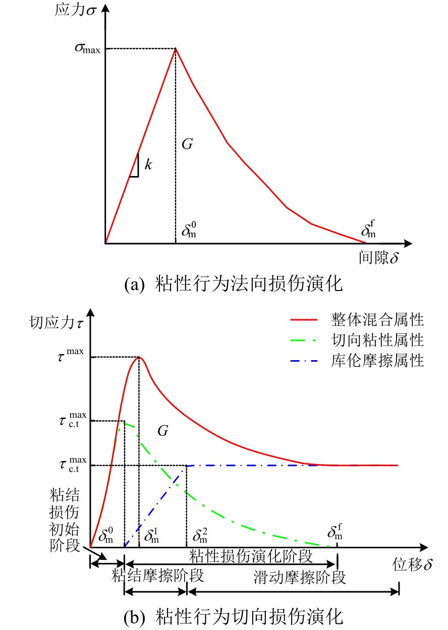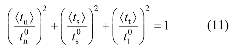 式中:〈tn〉、〈ts〉、〈tt〉分别为粘结界面法向、第一切向、第二切向接触应力;