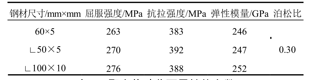 钢材尺寸/mm×mm 屈服强度/MPa 抗拉强度/MPa 弹性模量/GPa泊松比60×5 263 383 246∟50×5 270 392 2470.30∟100×10 276 388 252