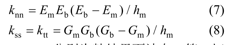 ABAQUS接触属性中的粘结属性需要指定弹性刚度矩阵。本文不考虑刚度耦合效应,只需指定三个主应力方向的刚度knn、kss及ktt。关于粘结界面三向刚度的取值,可由式(7)、式(8)[25]确定: